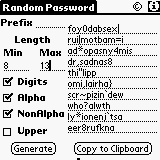Generate up to 10 easily remembered Random Passwords using your own specifications. You can generate passwords in length from 2-16 characters, and include Alphabetic characters (lower & uppercase), numbers, and Non-Alphanumeric characters. This allows you to copy the passwords into your clipboard. The unregistered version is limited to only generating 1 password at a time and not being able to copy it into the clipboard. You also cannot uncheck the NonAlpha box. Try before you buy.