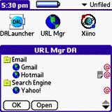 The Universal Resource Locator (URL) Manager is used to manage and organize the URL address / Web Site / Bookmark / Bookmarks in the most convenience way. The main features of this software include: a. Support Drug and Drop of the record b. Folder supported c. Open the url in the browser you choose in Palm d. Custom input shortcut list e. Two custom fields for you to save data f. Can Export data to a html file which support hyper-link g. Password to lock the application h. Data will be encrypted in the pdb file i. Provide a DA to see the data everywhere